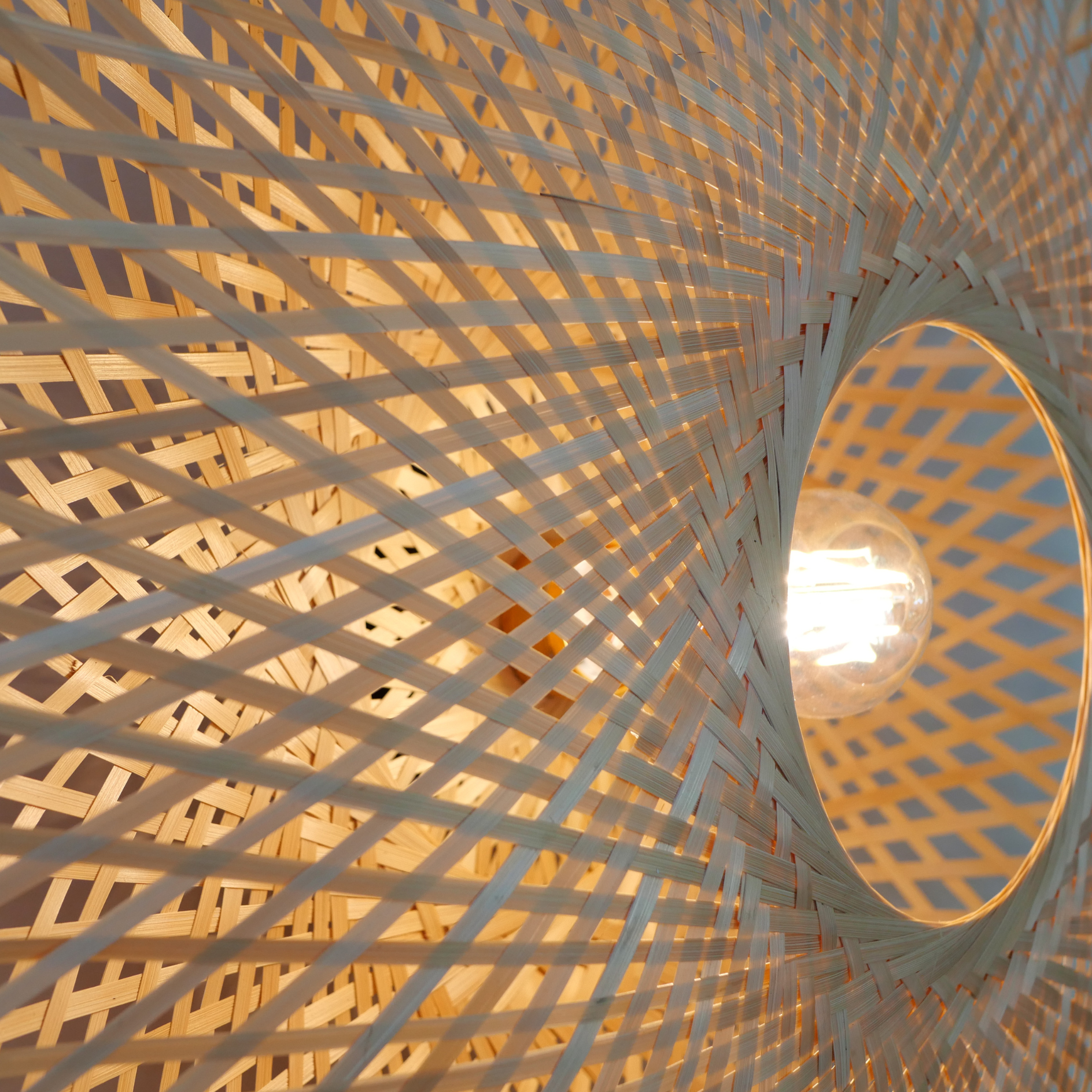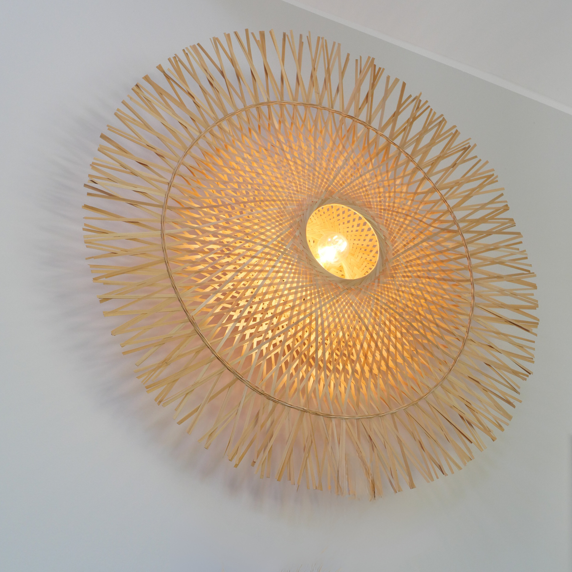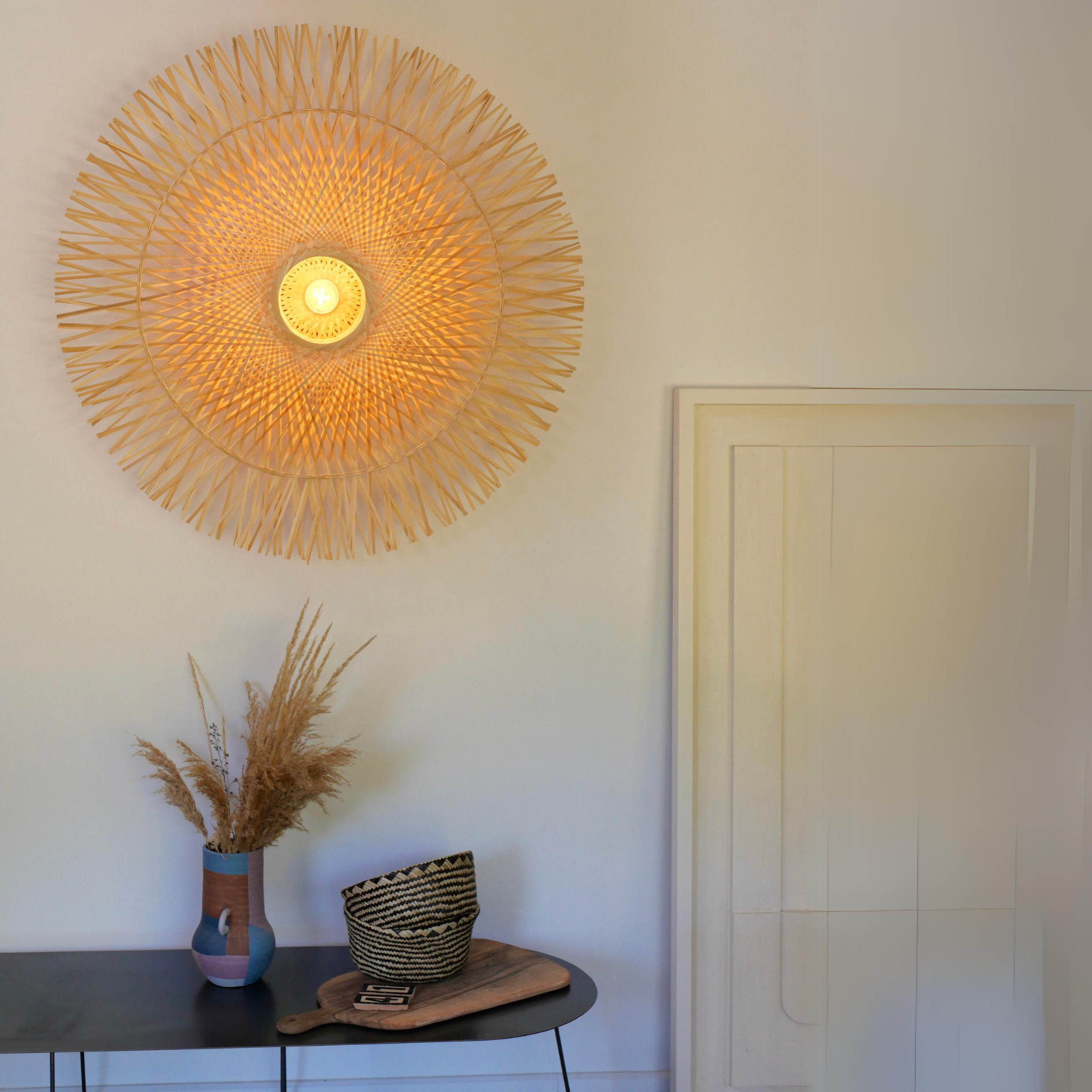 La SUSPENSION EN BAMBOU SOLEIL est parfaite pour ceux qui recherchent un éclairage décoratif qui peut également fonctionner comme une œuvre d'art. Utilisez-la pour illuminer votre salle à manger avec une lumière douce et accueillante, ou ouvrez-la pour créer un effet dynamique de soleil dans votre salon ou hall d'entrée. Son design flexible et sa grande taille en font un excellent choix pour faire une déclaration décorative audacieuse, tout en apportant une lumière chaleureuse et une atmosphère relaxante à votre maison.